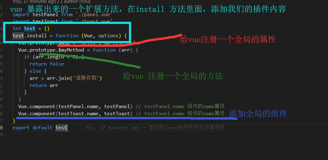 关于为什么需要在install这个方法这里添加我们的方法,可以参考官网。https://cn.vuejs.org/v2/guide/plugins.html 这里只是用了其中的一部分的内容。