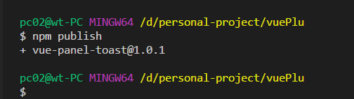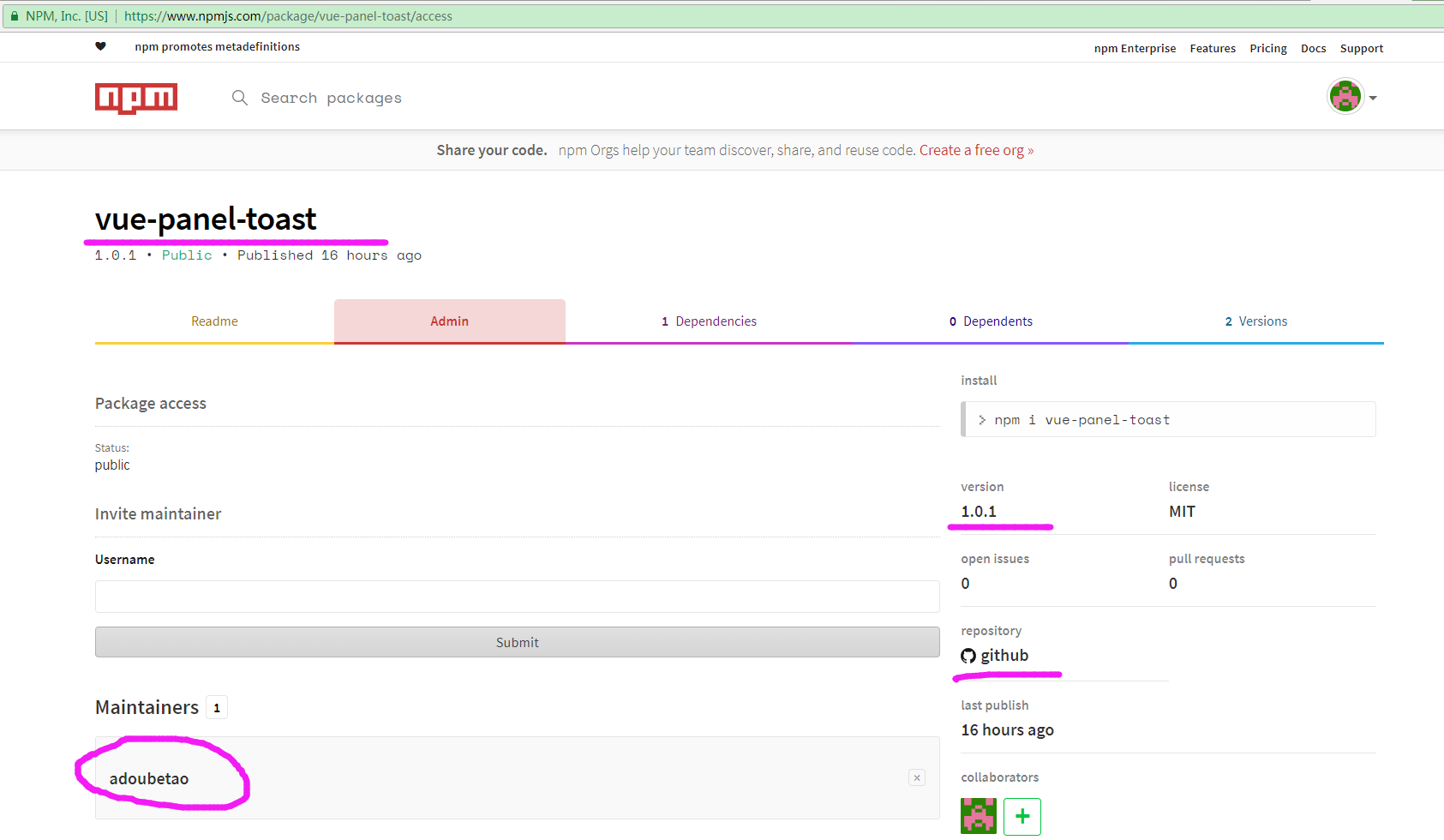 我们顺便看看,npm 官网是不是有我们的刚才发布的内容,https://www.npmjs.com/package/vue-panel-toast