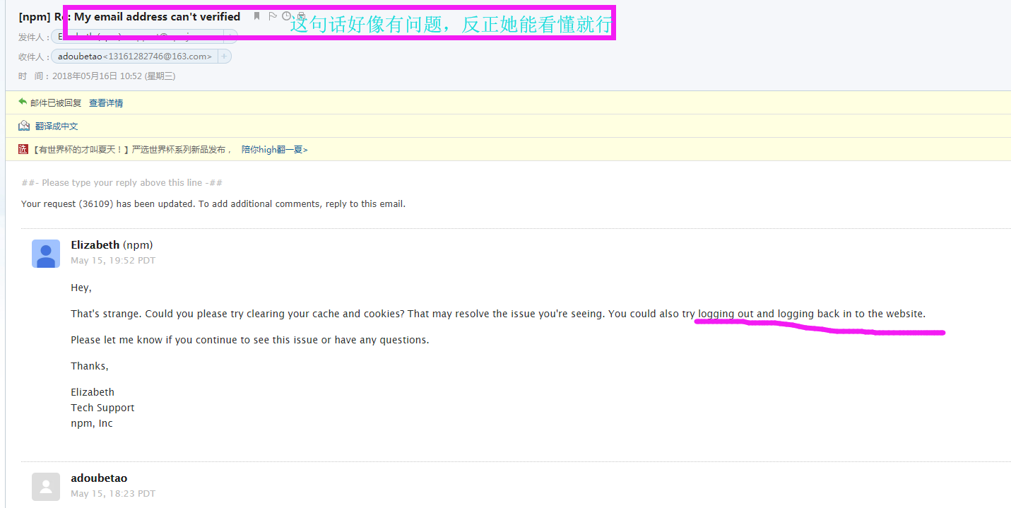 (插一句:注册账户我遇到一个坑,注册完后,npm官网的小姐姐会让你验证邮箱,验证完成后,需要退出登录重新登录,不然会一直提示你要验证邮箱),蹩脚的邮件交流如下,请忽略细节,仔细看划线位置。